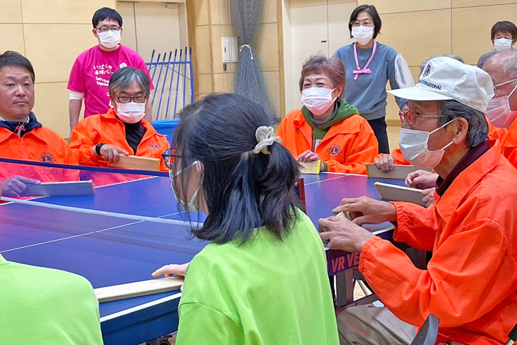 2月12日、日立市池の川さくらアリーナのサブアリーナで第4回日立市卓球バレー交流大会が行われた。卓球バレーは年齢や性別、障がいの有無などの区別なくみんなで楽しむことが出来るユニバーサルスポーツの一つで、コートは卓球台を使用、ルールはバレーボールが基になっている。1チーム6人がいすや車いすに座ってコートを囲み、金属球が入った音の鳴るボールを細長い板状のラケットで打ち、3打以内にネットの下を転がして相手コートに返球する。日立きららライオンズクラブ(小野瀬孝二会長/30人)は昨年度から協賛しているが、茨城県卓球バレー協会のご厚意で今年から「日立きららライオンズクラブ杯」として冠を付けていただき、今回は記念すべきその1回目となった。