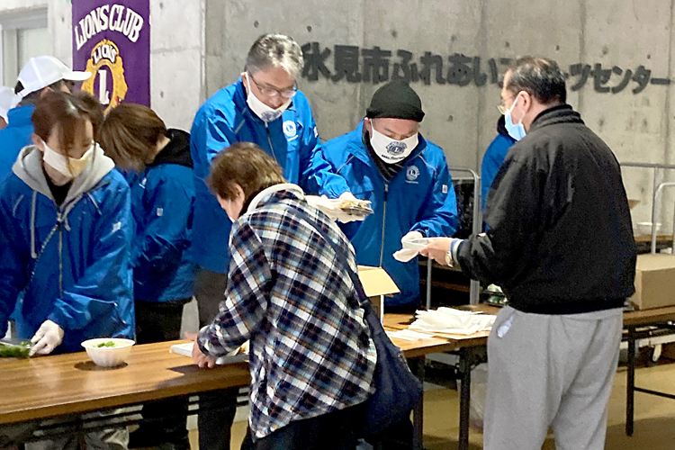 センターで活動を続ける傍ら、氷見ライオンズクラブは1月13日に氷見市内の避難所で炊き出しを実施している。その少し前、クラブメンバーでもある林正之市長から中村会長に連絡が入り、ライオンズクラブや他の団体で避難所での炊き出しを行ってもらえないか、と打診があった。避難所では5日から9日にかけて自衛隊がおにぎりを配布したが、その後の食事提供をどうするかが課題になっていたのだ。中村会長はすぐに事態の打開に動く。ライオンズクラブ、青年会議所、ロータリークラブ、観光協会、商工会議所青年部会に、副市長も加わったグループLINEを作成。団体間で日程を調整し、交代で炊き出しを行うことになった。10日には氷見中央ロータリークラブと氷見青年会議所がうどんを提供。13日にはライオンズクラブが大鍋で作った100人分の豚汁と助六寿司を振る舞った。この日は雪が降って冷え込みが厳しく、熱々の豚汁は避難生活を送る人たちに喜ばれた。