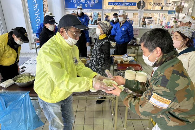 27日に行われたボランティアセンターでの炊き出しには、新湊ライオンズクラブのメンバー11人の他、小杉ライオンズクラブから7人、となみセントラル ライオンズクラブから3人の応援も駆け付けた。昼食の時間に合わせて豚汁約150食を用意。重労働を終えたばかりのボランティアからは「体が温まる」「午後もがんばろうという気力が湧く」などと感謝の言葉が寄せられた。