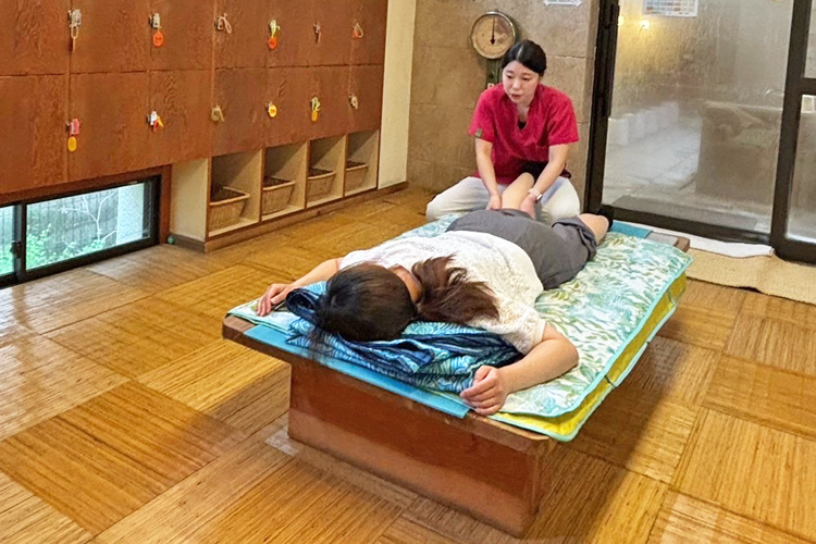 ③ 参加者の費用負担は入浴料金のみ。子どもの入浴介助が行えない分、ママへのサービス拡充に力を入れ、無料スイーツバイキングと整体師のマッサージを用意する
