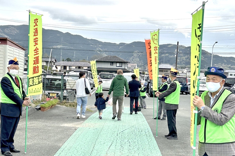 園バスの駐車場とこども園は、緑の歩道・グリーンロードで結ばれている。新入園児たちが保護者に手を引かれながら初めて通るこの道で、クラブメンバーはのぼり旗を持って歩道の両側に立ち園児と家族に交通安全を呼びかけた。これからも市内の未就学児童の交通事故をなくすために、園児たちと触れ合い交流しながら交通安全啓発活動を続けていきたい。