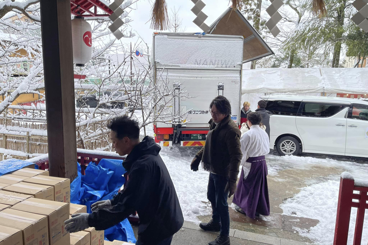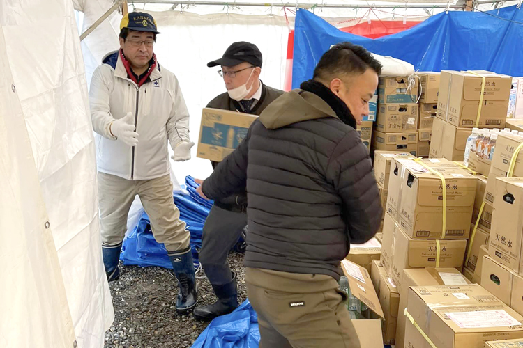 佐倉ライオンズクラブはその後も後方支援を継続。夏海さんと宮本さんがクラブからの見舞金と支援物資を携えて金沢を訪れたのは、地震発生から1カ月余りが経った2月15日のことだ。2人は石浦神社で金沢ライオンズクラブのメンバー6人の出迎えを受けて再会を喜び合い、翌日には輪島サテライトに支援物資を届けた。
