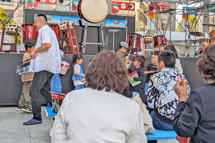 子どもを対象としたワークショップでは、ロックバンド・THE BLUE HEARTSの元ドラマー、梶原徹也氏によるリズム遊びが開催された。梶原氏は現在、音楽を通して子どもや障がいのある人と交流する活動に積極的に取り組んでいる。参加した子どもたちはプラスチックのバケツに色とりどりのガムテープを貼って太鼓を作り、自作の太鼓を使って楽しむリズム遊びに大興奮。その後、梶原氏のかけ声に合わせて広場中を行進しながら練習の成果を披露してくれた。