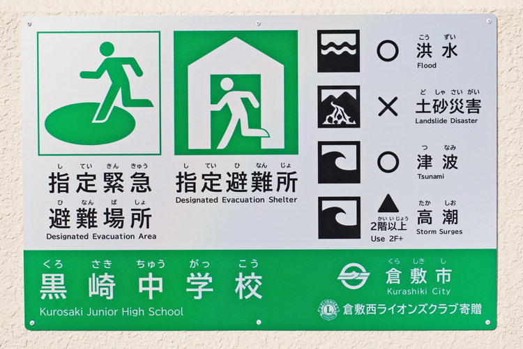 倉敷市ではこうした災害に備えて各所に指定避難所を設置しているが、災害の種類によって避難所の適不適があり、最寄りの避難所が必ずしも安全な避難所ではないケースも生じる。しかし、そうした違いをしっかり認識している住民は少ないし、各避難所にも適正が一目で分かるような案内看板類は整備されていなかった。