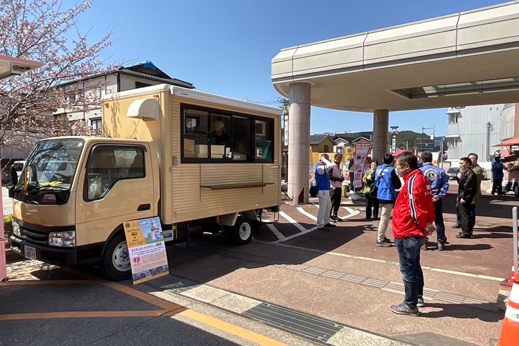 輪島市役所へ向かう途中、輪島市ふれあい健康センターで、335-B地区(大阪府・和歌山県)アラート委員会による「キッチンカーキャラバン in 能登」が行われているのに遭遇した。地元の事業者の支援を兼ねて被災者に食事を提供する支援で、さすがライオンズと誇らしく思った。