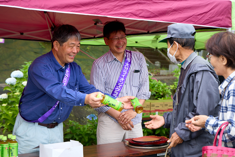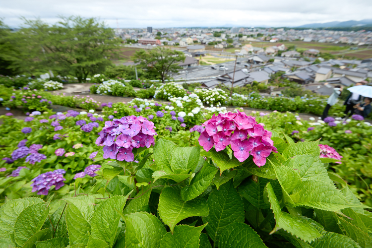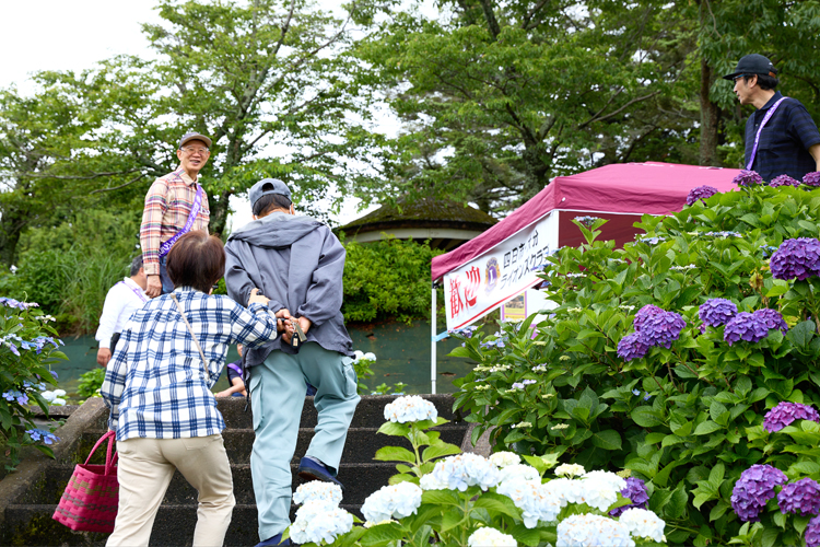 緩やかな斜面にあるあじさい園には、つづら折りの遊歩道が設けられている。訪れた人たちは色とりどりのアジサイを愛でながら斜面を上ってきて、ライオンズの出迎えを受ける。クラブから地元の名物「親玉まんじゅう」と緑茶を振る舞われた人たちは、ベンチに腰かけて一休みしながら、アジサイ越しの街の風景を眺めていた。