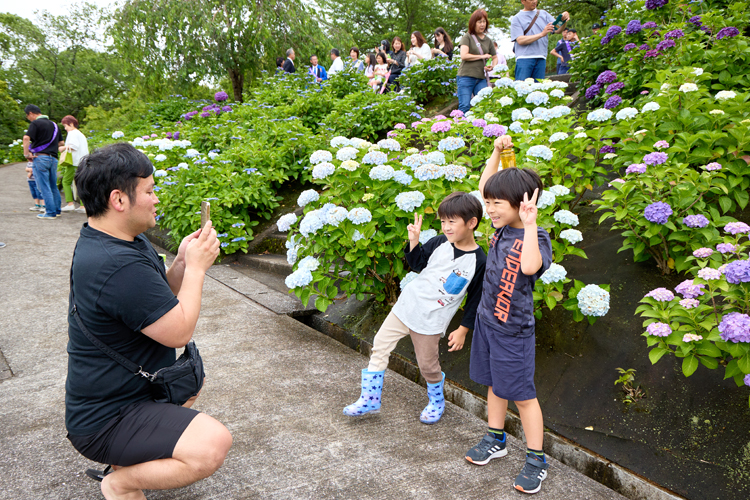 ちょうど満開を迎えたあじさい園では、小さな子どもがいる家族連れや、仲良く手を取り合って歩く老夫婦、友人同士のグループなどが思いおもいに楽しんでいる。