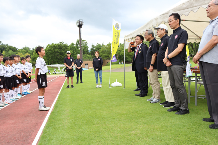翌10日の交流試合前に行った歓迎式には、332-D地区(福島県)の車田信彦地区ガバナーと当クラブ会員24人が参加。古川会長からは「しばし震災を忘れて思いっきりサッカーを楽しんでください」、車田地区ガバナーからは「福島での経験が一生の思い出になればと思います」と歓迎の言葉を贈った。セブン能登ジュニアの村田琉生主将(11歳)は「地震発生でなかなか練習出来ない中、サッカーが出来る日々が当たり前ではないと感じた。福島で貴重な体験をさせてもらえてうれしい」と話した。