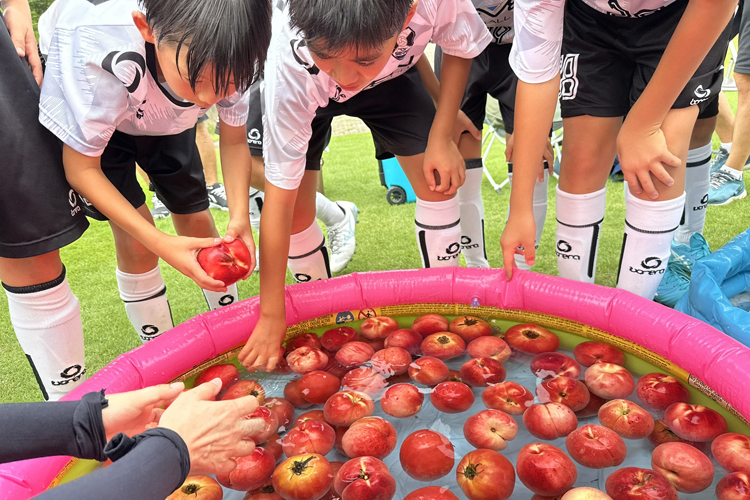 交流試合初日の会場は、福島県営あづま総合運動公園。補助陸上競技場の天然芝ピッチで、福島、山形、石川各県から集まった小学5、6年生の8チームによる交流試合を行った。各試合後はそれぞれのチームの選手同士が交流する場面も見受けられた。試合の合間にはクラブメンバーが用意した福島特産の桃、キュウリ、トマトやアイスクリームが提供され、子どもたちはしばし暑さを忘れて味わっていた。