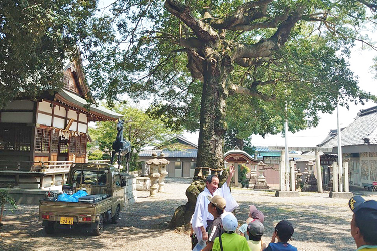 8月3日朝9時30分、員弁(いなべ)郡東員町に鎮座する猪名部(いなべ)神社に、放課後子ども教室の小学生21人と、ライオンズメンバー9人を含む大人25人が集合し、清掃作業と自然体験教室を行った。員弁ライオンズクラブ(24人)と放課後子ども教室が合同で行っている活動で、今年で10年目になる。今回は、東員町商工会青年部、明治安田生命いなべ支店の協力を得て実施した。