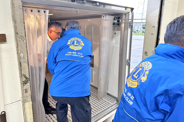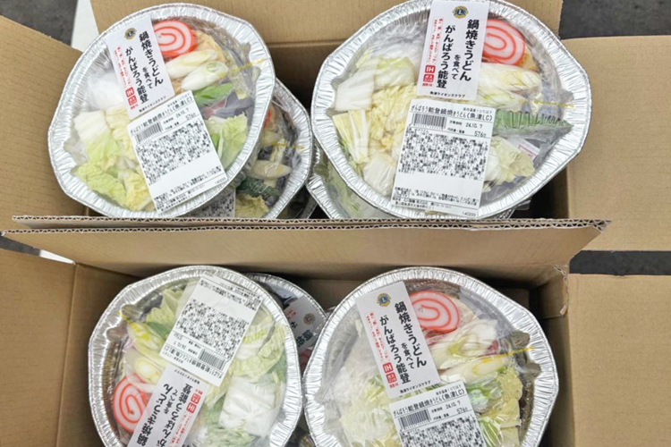 令和6年能登半島地震で甚大な被害を受けた被災地で、追い打ちをかけるような豪雨災害が発生した。魚津ライオンズクラブ(吉田讓会長/51人)は10月6日、メンバー9人を能登に派遣して、穴水町、輪島市、珠洲市の被災者へ食料を届けた。配布したのは、鍋焼きうどん490食(穴水町60食、輪島市門前町270食、珠洲市狼煙町110食、珠洲市河浦町15食、珠洲市上戸町35食)と富山大根170本(穴水町60本、輪島市門前町60本、珠洲市狼煙町50本)。また珠洲市では、全国のライオンズクラブから寄せられた支援物資の仕分け作業や、車両2台に分かれての物資運搬も行った。