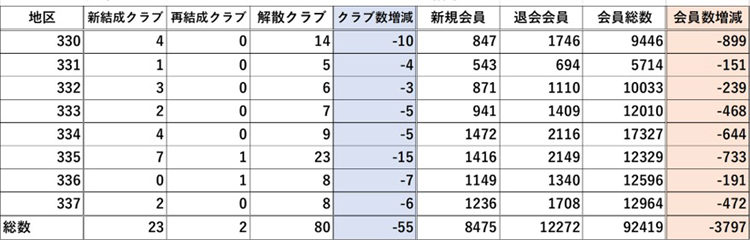 国際協会の集計によると、2023-24年度末(2024年6月末)の世界の会員数は133万8145人(期首から3579人純減)で、2027年7月までの150万人達成には今年度から毎年5万4000人の純増が必要である。昨年度の日本の結果は下図。各複合地区とも新クラブ結成、新会員獲得に大変なご尽力をいただき成果を上げたものの、残念ながらマイナスの結果となった。