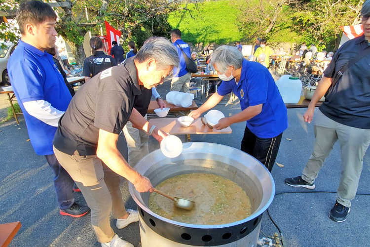 当日はまず、メンバーが所有する施設を借りて昼食に振る舞う豚汁の下ごしらえを行った。中には50年ぶりに包丁を握ったというメンバーもいて、手際の善しあしはともかく、皆が真剣に楽しく取り組む姿が印象的で、実に充実した時間であった。