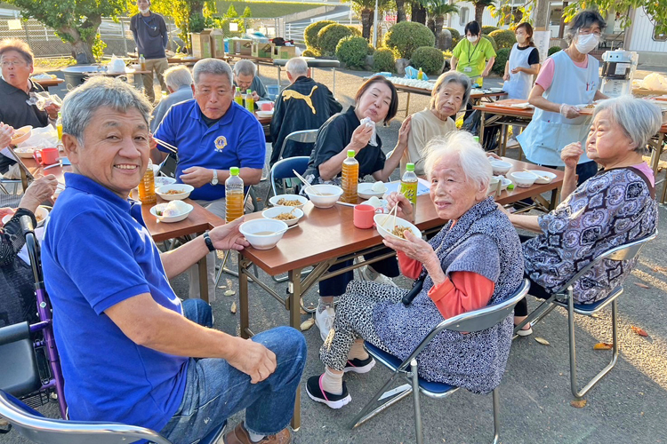 天候にも恵まれて野外に設けた交流の場では、爽やかな秋風を感じながら入所者と共に会食を楽しんだ。その際、施設への支援品としてかき氷機を贈呈すると、たいそう喜んでいただけた。続くカラオケの時間には、参加者の皆さんが楽しそうに歌う姿が印象的だった。会場には笑顔があふれ、和やかな雰囲気の中で交流会を終えることが出来た。