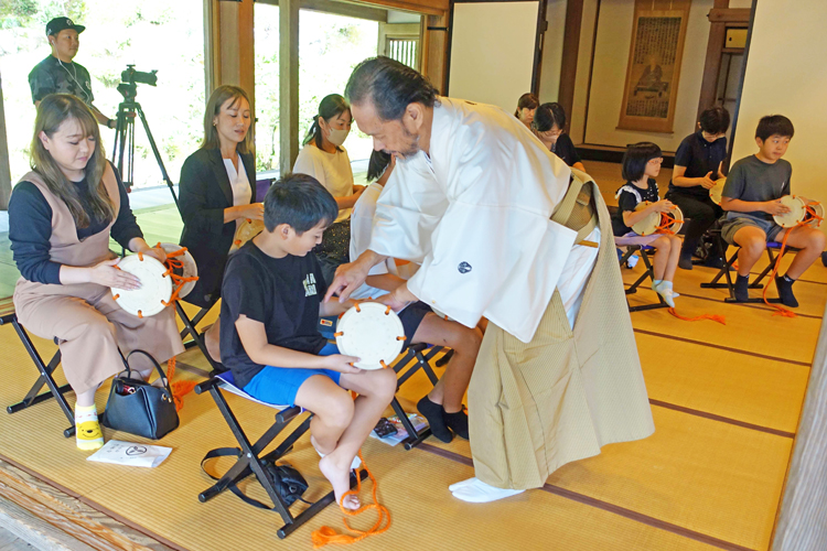 高知鷹城ライオンズクラブ(36人)は10月5日、四国霊場第三十一番札所である竹林寺の書院において、能楽師・囃子(はやし)方大倉流大鼓(おおつづみ)奏者である大倉正之助氏を講師に招き、小中学生とその保護者を対象とした親子大鼓教室を開催した。大倉講師は大倉流大鼓を継承すると共に、国内外のアーティストと共演するなど、伝統の枠にとどまらない幅広い活動をしている。本教室は、普段接する機会の少ない大鼓の演奏を通して日本の伝統音楽や文化に触れてもらい、子どもたちの健やかな成長の一助となることを目指し、クラブ結成65周年記念事業として実施したものだ。