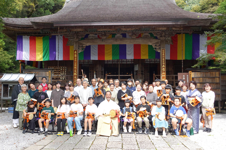 大倉講師の「よー」「ほー」というかけ声に合わせ、皆で呼吸を整えて大鼓を打つと、きれいに音がそろった。まさに調和の取れた演奏であり、打ち終わった参加者からは驚きと感動の拍手が沸き上がった。最後には、竹林寺の本堂で参加者全員による奉納演奏を行い、稽古の成果を御本尊様に聞いていただいた。