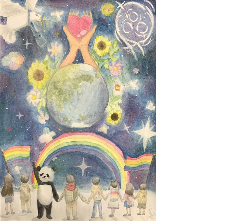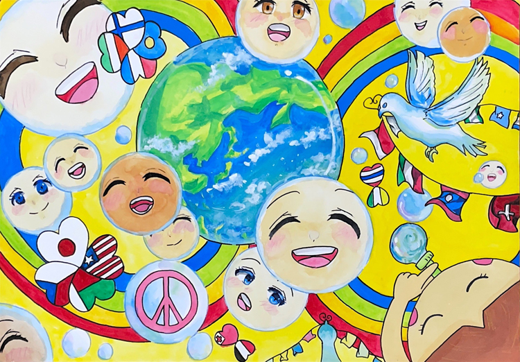「世界中の人々がお互いに優しくあり、幸せに満ちた平和な世界になることを願ってこの絵を描きました」(原文英語/編集部訳)