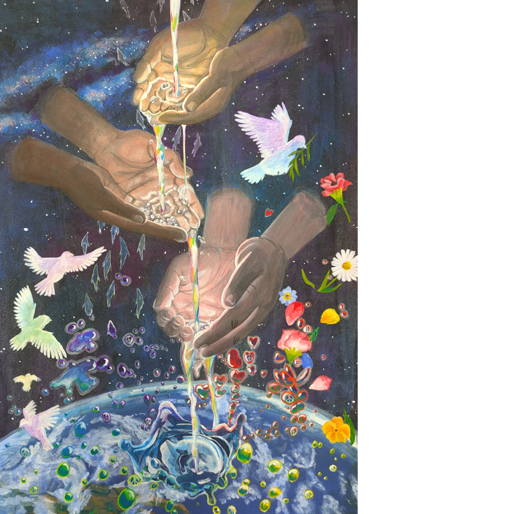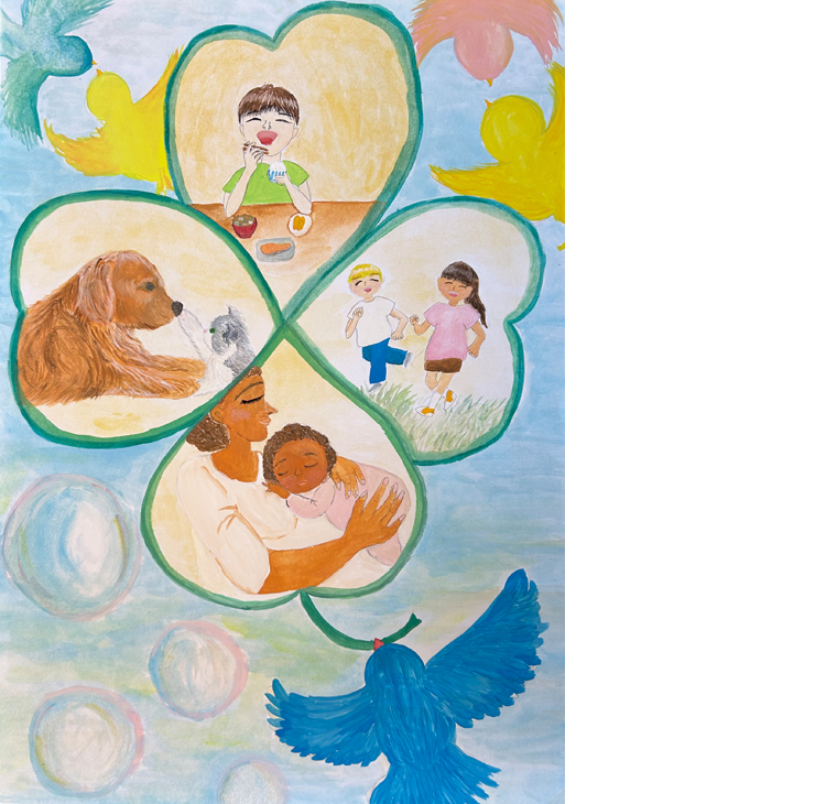 「人間の精神的な幸福感や現実的な必要が満たされた時に平和は存在すると、私は思います。それをより多くの人が得るには、自分一人の手の中に抱え込まず、互いに分かち合う必要があるのではないでしょうか。私の絵を通して『分かち合う優しさ』の大切さを感じ取っていただけたら幸いです」