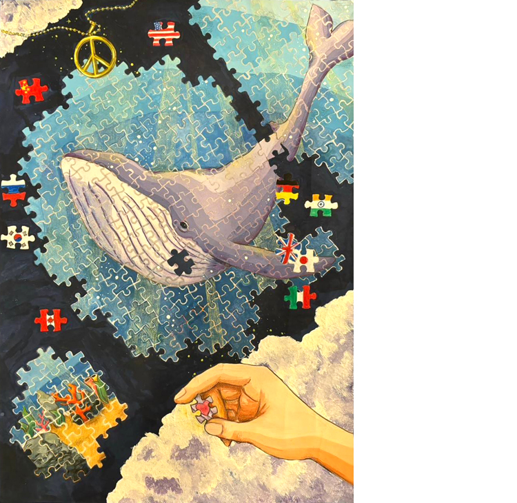 「広がる暗闇は戦争や貧困・災害を示し、今後の不安が雲。クジラの心臓のピースは、地球にいる全ての命の闇の中でも希望の光はあり、平和のピースを一人一人がつなげていくことで、限りない平和を広げていける」