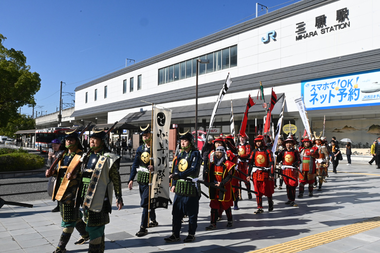 瀬戸内海に浮かぶ島々の絶景と名物のタコで知られる三原市は、毛利元就の三男・小早川隆景が築いた三原城の城下町でもある。山陽新幹線の停車駅でもあるJR三原駅はその本丸跡にあり、駅舎は天守台の巨大な石垣にくっ付くようにして建っている。河口を埋め立てて築かれた城は城郭と軍港の機能を備え、満潮時には海に浮かんで見えたことから別名「浮城」と呼ばれ、毎年11月初旬の三原浮城まつりでは、駅周辺でさまざまな催しが開かれる。