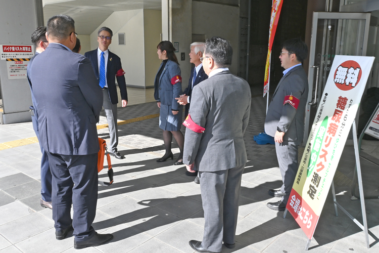 そんな地元のシンボルをクラブ名に持つ三原浮城ライオンズクラブ(石本栄次会長/85人)が、三原浮城まつりに合わせて実施しているのが、市民を対象とした糖尿病リスク測定だ。三原駅構内にある観光案内所「うきしろロビー」の一角を会場に、三原薬剤師会と連携して無料で提供する活動で、今年も祭り当日の11月9日、午後1時から4時まで実施した。石本会長はこの活動の目的を次のように説明する。