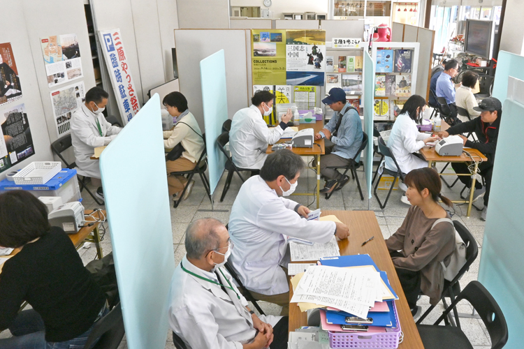 多くの市民が集まる三原浮城まつりに合わせて企画されたこの事業だが、今年から祭り会場が駅の反対側に移動し、うきしろロビーがある側の人出はめっきり減ってしまった。それでも、メンバーによる事前のPRと、駅前や祭り会場での呼びかけが功を奏し、リスク測定の会場には途切れることなく希望者が訪れ、一時は30分待ち時間を要するほどだった。