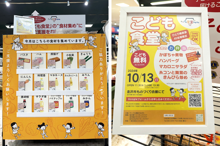 活動が広がりを見せる中で、複合地区のFWTコーディネーターの間で課題となっていたのが、子どもたちへの食料支援の活動をクラブが安定的、長期的に運営するにはどうすればよいか、という点でした。その課題を見事にクリアし、全国のクラブへの手本になると確信している取り組みがあります。「テンプル食堂かなざわ」を運営する石川県・金沢兼六、金沢城北、金沢みもざの各ライオンズクラブが、協力企業の地元スーパーマーケットとの連携で実現させた活動です。