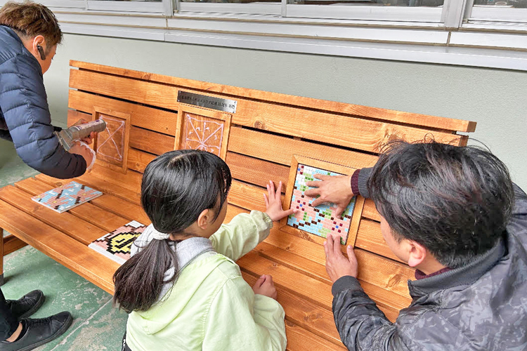 そして、2026年秋に亀岡市を含む地域で開催されることが決まった「第43回全国都市緑化フェアin京都丹波」に向けた作品としてベンチを作り、会場となる亀岡保津川公園に設置してもらうことになった(フェア開催までは亀岡市役所に設置)。木製のベンチにクラブメンバーが塗装などを手がけ、子どもたちがデザインしたタイルアートをはめ込んだ。