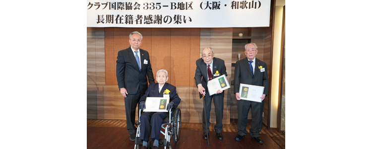 去る4月3日、ホテル日航大阪において「335-B地区長期在籍者感謝の集い」が盛大に開催されました。本会は、40年以上の長期にわたり在籍され、ライオニズムの発展と人道奉仕に尽力されたメンバーの皆様へ感謝を表す場として設けられたもので、今回で4回目となります。