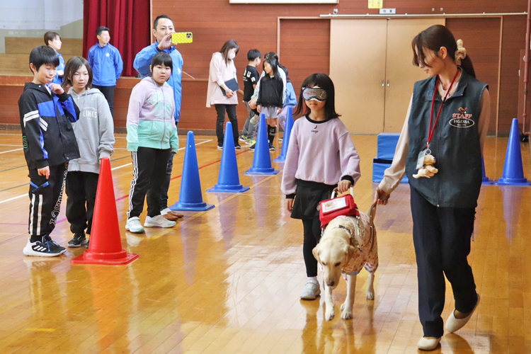 今年度は留萌市内の小学校を対象に初めての盲導犬教室を開催した。5月9日、午前は市立緑丘小学校4年生の12人、午後は市立東光小学校2年生の42人を対象に実施。北海道盲導犬協会から講師の勝野妃奈さんと盲導犬ワフ号(PR犬)を派遣してもらい、パワーポイントを使った講話やDVD鑑賞、盲導犬との歩行体験など体験型の授業を行った。歩行体験では、児童たちは初めての目隠し歩行に緊張していたが、「貴重な体験が出来ました」と話してくれた。