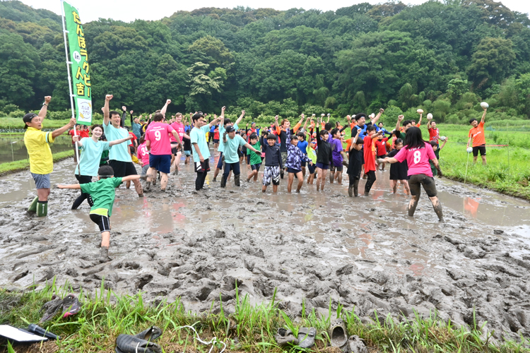 田植えを前に水をたたえた田んぼに歓声が響く。田んぼラグビーのだいご味は、豪快なトライだ。頭から思い切り泥に飛び込むトライに、大きな拍手が沸き起こる。称賛を受けるのは、華麗なステップやパスワークよりも、どれだけ泥まみれになるかだ。