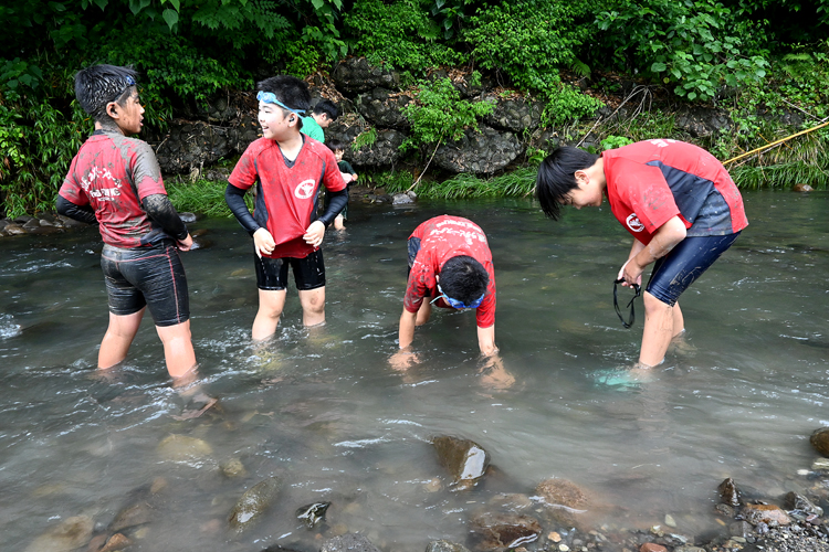試合は得点による勝敗は競わず、互いに健闘をたたえ合ってノーサイドとなる。試合が終わると、選手たちは泥まみれのまま近くの小川へ。せせらぎの中に入って泥と汗を洗い流した。