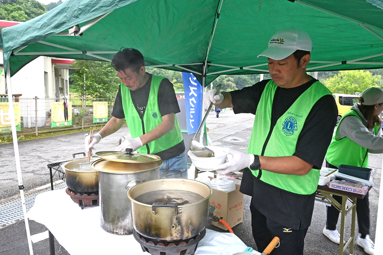 人吉ライオンズクラブは大会本部に設置したテントで、飲み物やうどんを販売。選手たちは温かいうどんで疲れを癒やした。子どもたちのため、豪雨災害からの復興途上にある人吉のため、人吉ライオンズクラブは田んぼラグビーをますます盛り上げていこうとしている。