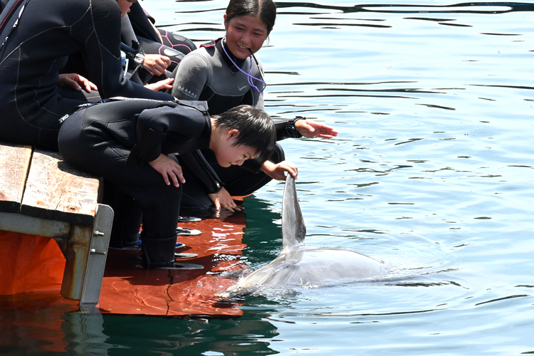 参加者の中には、最初から進んで積極的に活動に参加する子もいれば、なかなか馴染めない子もいる。教室が始まってまもなく、ウェットスーツを着るのを嫌がって泣き出した男児がいた。大人2人でなだめながら何とか着せていけすまで行ったものの、座り込んだままイルカに近付こうとしない。そのまま終わると思いきや、イルカと泳ぐ仲間たちの姿を見ているうちに、一言「やる」とつぶやいた。