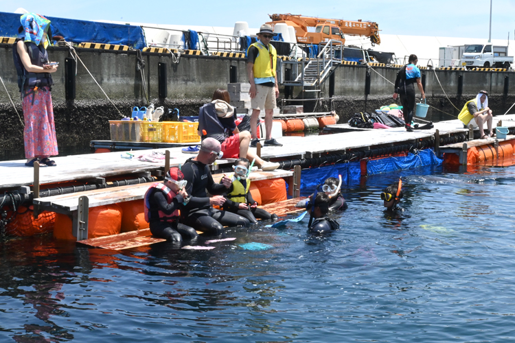 教室当日の午前10時、香川会長から参加者に「イルカのいるいけすの上はすごく暑いので十分に気を付けて」と注意があり、教室が始まった。施設スタッフからイルカの顔ではなく体に触ることなどの説明を受けた後、ウェットスーツに着替え、ライフベストを着けて、イルカの待ついけすへ向かう。