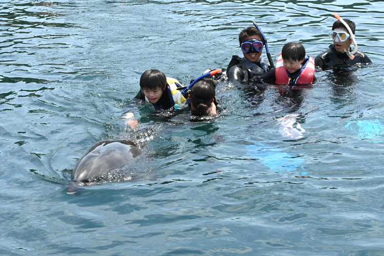 いけすでは、いかだの上から手を伸ばしてイルカの体にタッチしたり、餌をやったり、頰にキスしてもらったりして触れ合い、続いてはいよいよスイム体験。通常はマスクとシュノーケル、足ひれを着けて入るが、嫌がる子も多い。その場合は、スタッフが抱きかかえて水面に顔を出したままで泳げるようにする。恐るおそる水に入った子どもたちだったが、すぐに楽しそうな歓声が上がった。