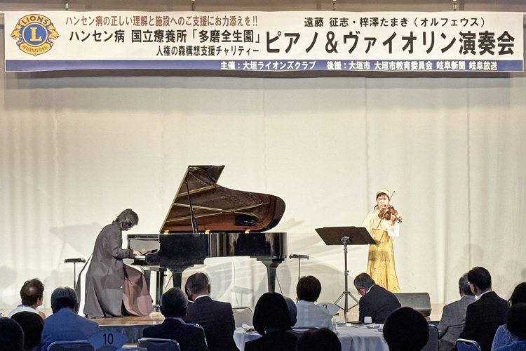 大垣ライオンズクラブ(62人)は市民社会福祉委員会の新しい事業として、「ハンセン病を再認識する勉強の時間」と「プロ演奏家の生演奏を楽しむ時間」を盛り込んだ音楽会を、9月1日に大垣市内のホテルで開催した。催しのタイトルは、東京都東村山市国立療養所「多磨全生園」人権の森構想支援チャリティー「遠藤征志・梓澤たまき ピアノ&ヴァイオリン演奏会」とした。