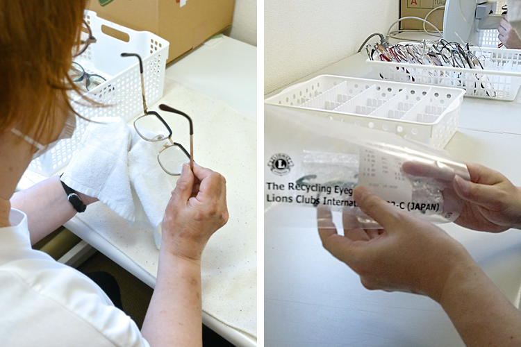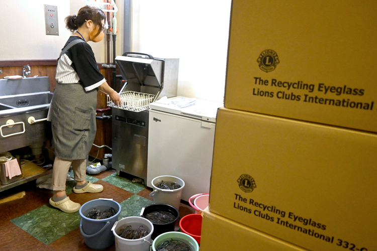 各地のライオンズクラブが収集した中古眼鏡は仙台市内にある332-C地区の事務局に届き、そこでセンターの運営を担う眼鏡リサイクルセンター運営委員会(木川田明弘委員長/仙台高砂ライオンズクラブ)のメンバーが個数を確認して、チャレンジビラに運び入れる。リサイクルの作業は大まかに次のような流れで進む。台所用洗剤に眼鏡を漬けた後に食器洗浄機で洗浄。丁寧に拭き上げてから、レンズチェッカーと呼ばれる機器でレンズの度数を測定し、数値を記したシールを貼って1本ずつ袋詰めする。それを度数ごとに仕分けし、海外発送用に梱包(こんぽう)して、作業は完了となる。