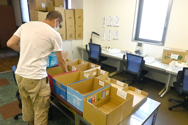 リサイクル作業できれいによみがえった眼鏡は、100本ずつ箱詰めされて支援先の国へ送られる。作業場の隅には、発送を待つライオンズ眼鏡リサイクルのロゴが入った段ボールが積まれていた。