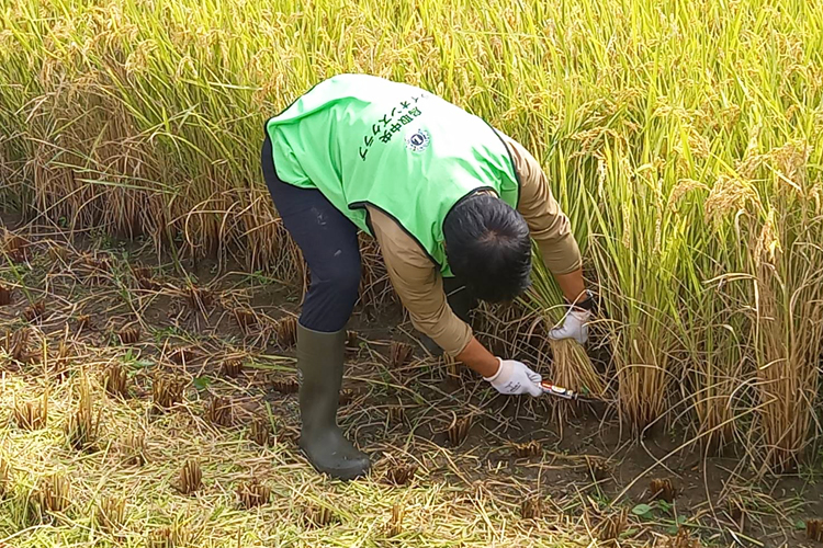 当日は前日までの雨が奇跡的に上がり、暑いくらいの絶好の稲刈り日和になった。6クラブから会員30人以上が集まり、収穫はノコギリ刃のカマで手刈りで行った。ザクッザクッと歯切れの良い音と同時に次々と刈っていくのは、なかなか気持ちがいい! 参加者の中には手刈りはもちろん稲刈りは初めてという会員もいた。事業の事前説明を行った時、「しっかり汗をかいてもらうために手刈りでお願いしますね!」と伝えていたので、心の準備はできていたものと思う。約40分間の作業を終えると「けっこう疲れたよ」「いい汗かいた」などという声と共に、皆でやって本当に良かったという声をもらった。