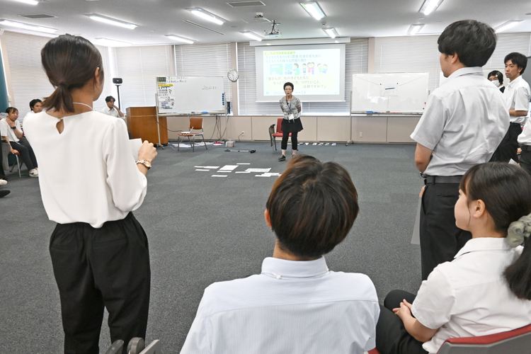 午前9時から午後4時半までのスケジュールが組まれた研修には、採用1年目の教員77人が参加。参加者は3会場に分かれて、ライオンズクエスト認定講師の柴咲子講師、寺西勉講師、横田秀策講師の3人によるワークショップを受講した。