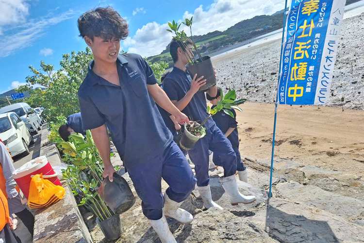 八重山ライオンズクラブ(高木正敏会長/53人)は、約40年前から石垣島の名蔵湾を中心にマングローブの植林活動を続けてきた。土地改良事業などによる赤土流出で、かつて白く美しかった浜が失われつつあったことが活動の原点である。当初は台風の影響や潮の干満により苗の活着が進まず苦労したが、研究者の指導により植栽位置や植え込みの深さを改良し、活着率は大幅に向上した。長年の取り組みは地域に根付き、名蔵湾の環境を守る基盤づくりに寄与してきた。