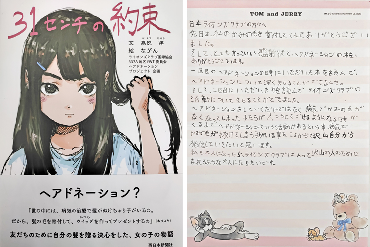 少女から2回目のドネーションを行いたいとの連絡をもらった時は、驚きと共に、活動を通して気持ちがつながっていたことに胸が熱くなった。今回は337-A地区(福岡県)のメンバーである矢野靖彦さんが企画したヘアードネーションプロジェクト書籍『31センチの約束』を贈ったところ、直筆の手紙がクラブへ届いた。かわいらしい便箋に書かれた手紙の最後には、次の一文があった。