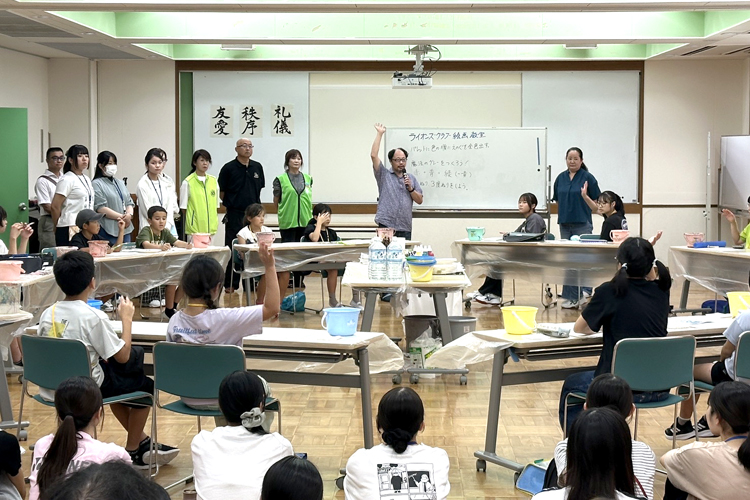 岡山県備前市の閑谷(しずたに)学校で行われたサマーキャンプでは、8月18日に絵画教室、19日にはキャンプファイヤーと縁日をライオンズが担当した。絵画教室は画家の先生2人に指導をお願いし、子どもたちに自由に絵を描いてもらった。キャンプファイヤーの後は、射的、輪投げ、すごろくなどの縁日を全員で楽しんだ。