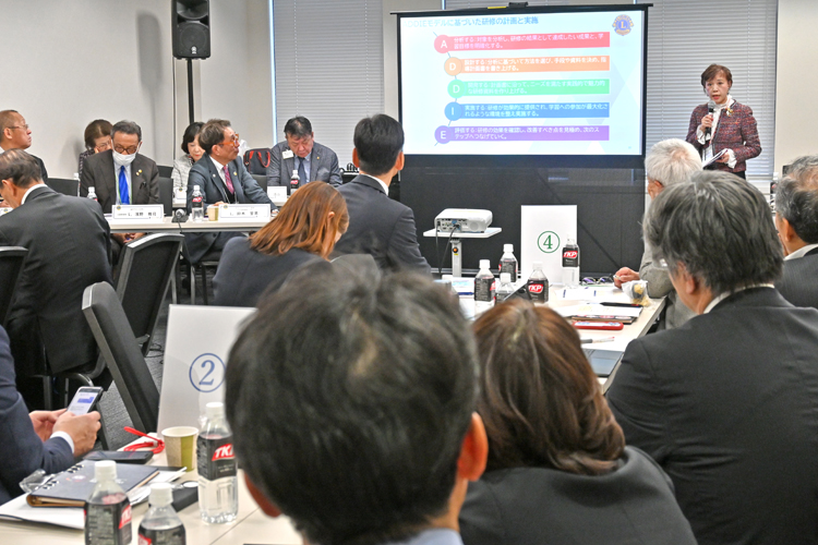 今回のリフレッシュセミナーでは、研修を企画する際に実践すべきADDIEモデルを確認して、女性会員拡大と若手会員拡大の二つのテーマに分かれ、テーマごとに研修指導計画書のドラフトを作成。Lion Portal(ライオンポータル)の活用など基礎知識の再確認をした上で、研修企画会議を想定した模擬セッションを全員が行い、お互いの「ファシリテーター」としての役割やスキルを評価し合うことで講師としての自己点検を行いました。