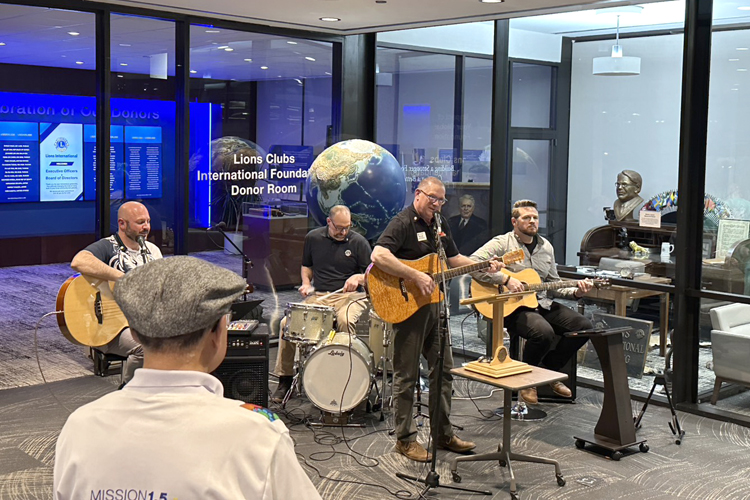 国際会長の執務室や各部のオフィス、展示室を見学、スタッフとあいさつを交わし、集まった執行理事や理事と再会を喜び合いました。ロビーで行われたセッションは、マーク・S・ライオン国際第1副会長を始めとするメンバーとスタッフによるバンド演奏、国際会長あいさつ、食事、ミッション1.5衣装コンテストと続きます。会議や食事の前には選ばれた理事によるインボケーション(お祈り)を行うのが慣例であり、会長指名により最初のスピーチは私が担当することとなりました。衣装コンテストはサンギータ・ジャティア元国際理事の提案であり、理事会メンバーの融和やアイデアを出し合うことが目的のようです。皆それぞれ準備をして臨み、優勝者は全員の多数決で決められ、結果は私が優勝となりました。このような余興にも積極的に参加をして各国の理事と言葉の壁を乗り越え、コミュニケーションを取ることで理事会においての存在感や影響力も育まれるのだと思いました。