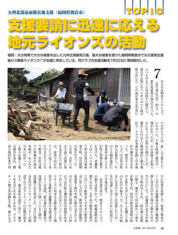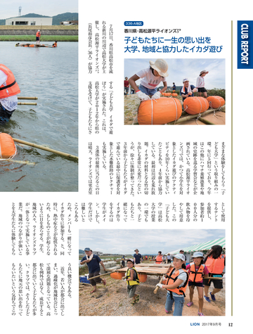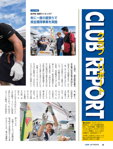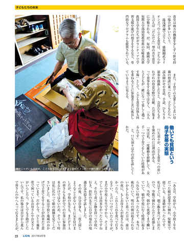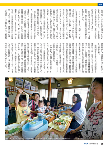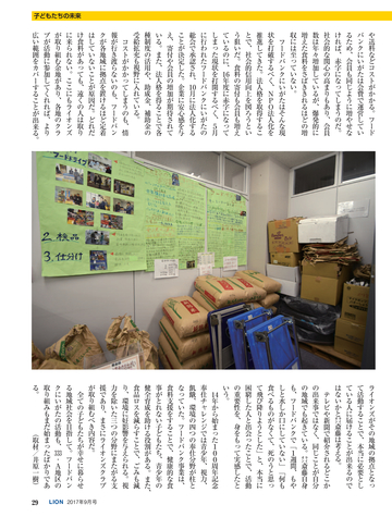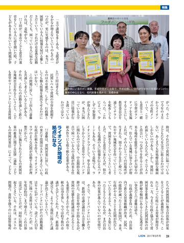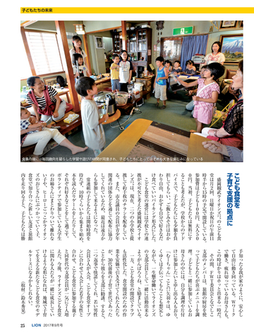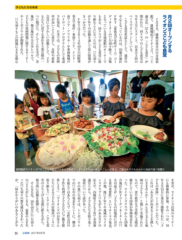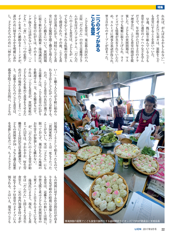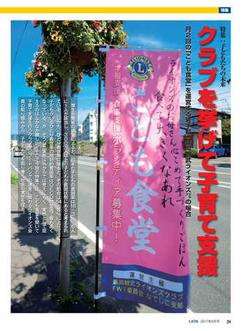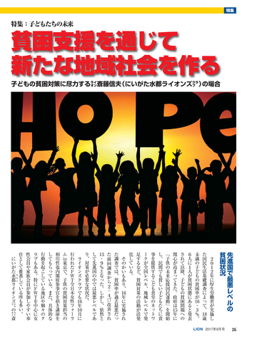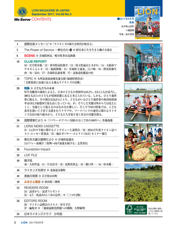 国際会長メッセージ ●「ライオンズの新たな時代が始まる」 The Power of Service 〜奉仕の力 ❿ ● 障害者に生き生きと働ける場を SCENE ● 茨城県阿見/岐阜県多治見陶都 CLUB REPORT 10:岩手県室根/12:香川県高松源平/14:埼玉県嵐山ときがわ/14:大阪府マ チカネくんレオ/15:福岡舞鶴/15:茨城県土浦北、江戸崎/16:群馬県桐生 西/16:富山/17:青森県弘前東奥/17:北海道札幌北の杜 TOPIC ● 九州北部豪雨被災地支援 (福岡県朝倉市) 「支援要請に迅速に応える地元ライオンズの活動」 特集 ● 子どもたちの未来 厚生労働省の調査によると、日本の子どもの貧困率は16.3%。6人に1人が該当し、 300万人以上の子どもが貧困状態にあると考えられている。しかも、ひとり親世 帯に限ると、その割合は54.6%に上り、子どもがいるひとり親世帯の相対的貧困 率はOECD加盟国で最も高くなっている。が、そうした実態は外からでは見えに くく、実感として捉えるのはなかなか難しい。そこで今回の特集では、こども 食堂を開いて子育て支援を行うクラブや、フードバンクの運営に関わるライオ ンズ会員の取り組みから、子どもたちを取り巻く社会の実態を探る。 国際理事だより ●「 『パワー・オブ・ウ ィ (団結の力) 』 で次の100年へ」佐藤義雄 LIONS NEWS CASSETTE 31:LCIFの今後に関するインタビューと説明会/32:2016-17年度ライオン誌ベ スト・エッセー賞発表/33:地区ガバナー・エレクト (DGE) セミナー報告 東日本大震災復興だより ● 宮城県塩竈市 3.11リレー連載㉗「復興へ向け前進を続ける」志賀重信 Foundation Impact LCIF FILE 獅子吼 40:大村哲也/41:片山浩幸/42:髙野貴世志/43:橋口啓一/44:杉本健一 ライオンズを探せ ● 北海道寿都町 表紙の背景 ● 岩手県山田町 ふるさと探訪 ● 秋田県三種町 READERS ROOM 54:読者から/読者プレゼント 55:も う一度読みたい 「あの記事」 ●「三つの宝物」 EDITORS ROOM 56:ライオン誌例会のススメ/次号予告 57:編集室 ● 「地球温暖化問題への挑戦」矢野敏明 日本ライオンズクラブ 分布図