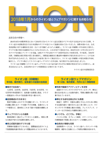 2014年10月の国際理事会において2018年1月からライオン誌公式版をデジタル化する決定がなされて以降、ラ イオン誌日本語版委員会では日本語版のデジタル化について協議を重ねてまいりました。国際本部からは、公式 各国語版に対する補助金を会員一人につき年額6㌦から4㌦に減額し、ライオン誌 (印刷物) の年4回以上発行と、 デジタル版の発行を義務付けることが示されました。これを受けて委員会では、2016年12月〜17年1月にかけて 全クラブを対象にアンケートを実施。3,095クラブ中1,810クラブ (回答率58.5%) の回答を得、その結果、 「2018年 以降、印刷版は現行程度の質と量を維持し、国際協会補助金と購読料の範囲内で発行出来る分でいい」とする回 答が73.9%を占めました。委員会はこの結果に基づいて検討を行い、ライオン誌 (印刷物) の発行回数を年6回、 隔月とし、デジタル版としてライオン誌ウェブマガジンを年12回、毎月発行する方針を決定しました。 ライオン誌 (印刷物) とライオン誌ウェブマガジンは下記の通りそれぞれの媒体の特長を生かした内容とし、読 者会員はもとより、会員以外の方々への情報発信にも努めてまいります。 ライオン誌日本語版委員会