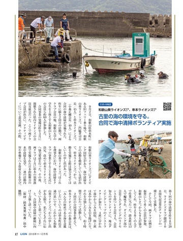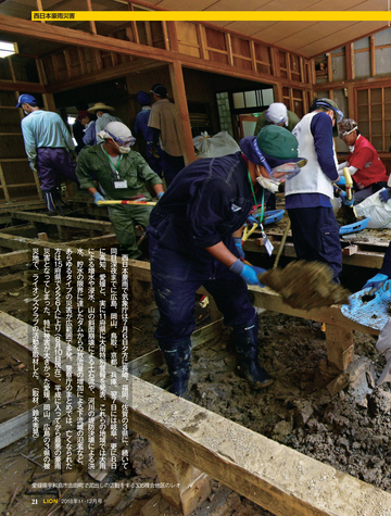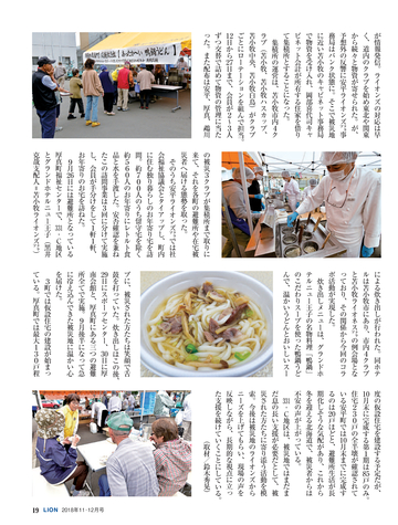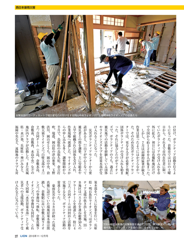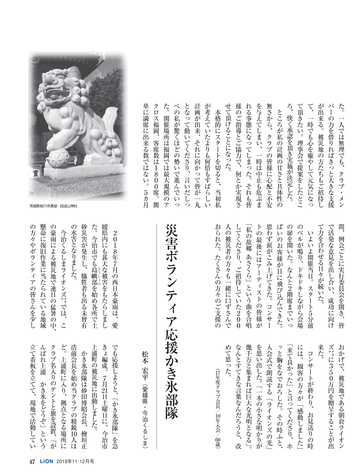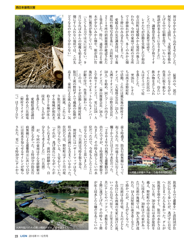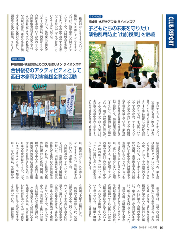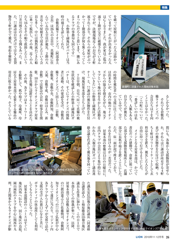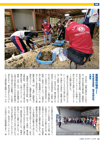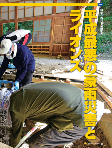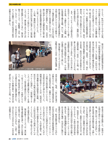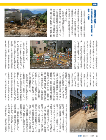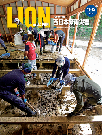 読者会員の皆様へ ●今号のライオン誌 特集のテーマは「西日本豪雨災害」 。平成に入って最悪 の被害となった西日本豪雨の被災地で、ライオンズクラブ の支援活動を取材。表紙は335複合地区レオによる愛媛県 宇和島市吉田地区での災害ボランティア活動。 ●投稿にご協力を 「クラブ・リポート」欄ではクラブの活動に関する投稿を 募集しています。700字程度の原稿に写真を添えてお送り に関して深く掘り下げ、各クラブの今後の活動の参考とな る記事を提供していきます。国際協会の奉仕フレームワー クである「糖尿病」 「環境」 「視力」 「小児がん」 「食料支援」 や、日本のライオンズが力を入れる「青少年育成」につい て、他クラブの参考になる活動事例がありましたら、情報 をお寄せください。 <送付先>