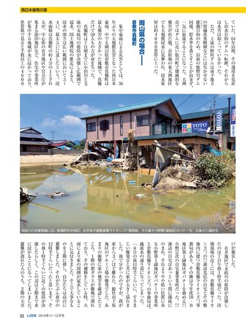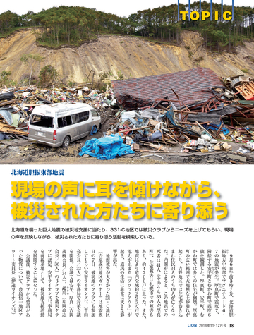 TOPIC ● 北海道胆振東部地震 特集 ● 西日本豪雨災害 西日本豪雨では11府県に大雨特別警報が出された。これらの地域では大雨によ る増水や浸水、山の斜面崩壊による土石流や、河川の堤防決壊による洪水、貯 水の限界に達したダムからの放流量の増加による下流域の氾濫など、あらゆる タイプの災害が広範囲で多発。亡くなられた方は15府県で226人に上り、平成に 入ってから最悪の豪雨災害となってしまった。特に被害が大きかった愛媛、岡 山、広島の3県の被災地で、ライオンズクラブの活動を取材した。